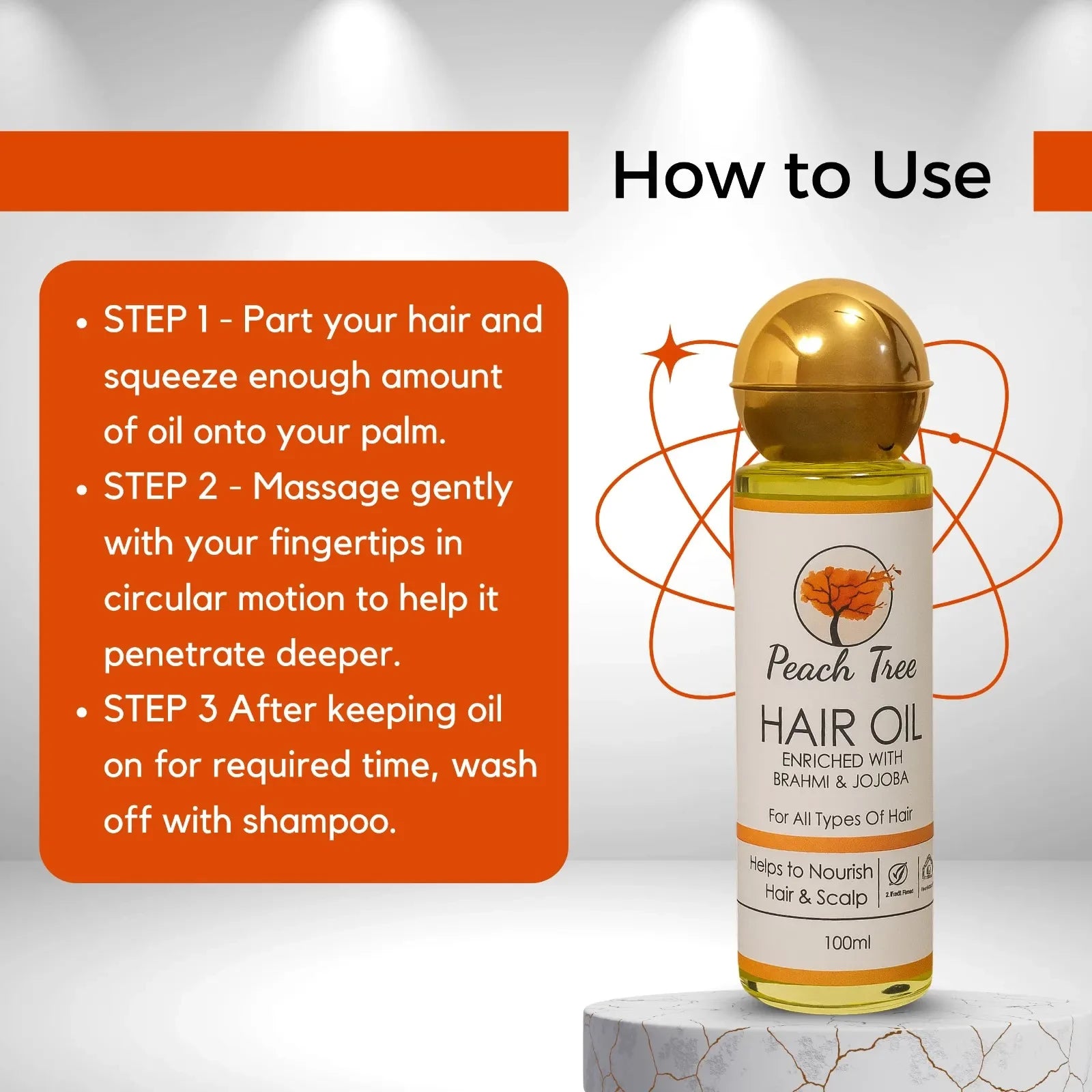 Peachtree Hair Oil is an all-natural blend of Brahmi, Jaborandi, Amla, Coconut, Almond, and Sunflower oils that deeply nourishes your hair and scalp. It helps strengthen roots, improves shine, and promotes natural, healthy hair growth.