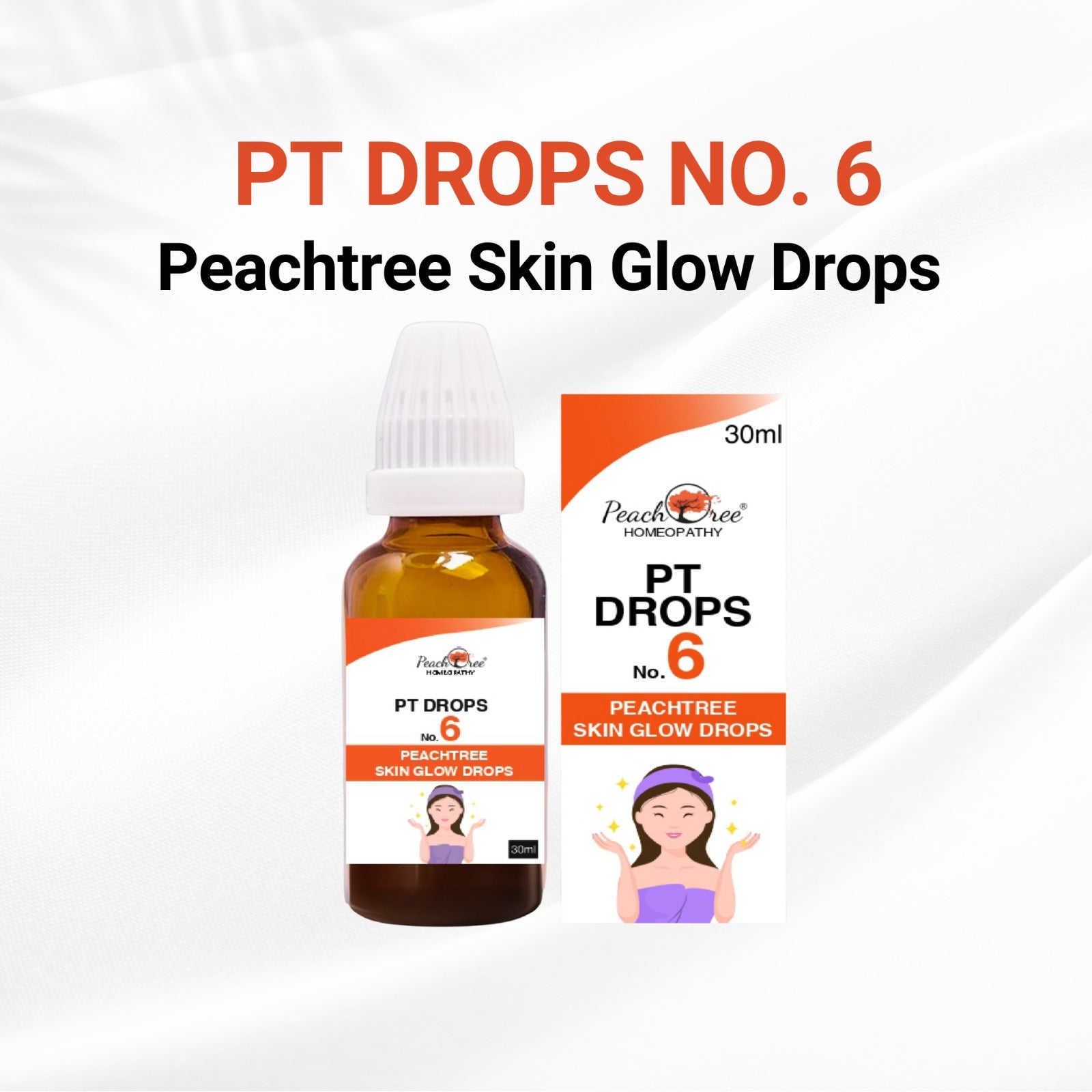PT Drops No. 6 is a homeopathic skin tonic that enhances natural glow and promotes clear, youthful skin. It helps reduce pigmentation, acne scars, and signs of aging.
